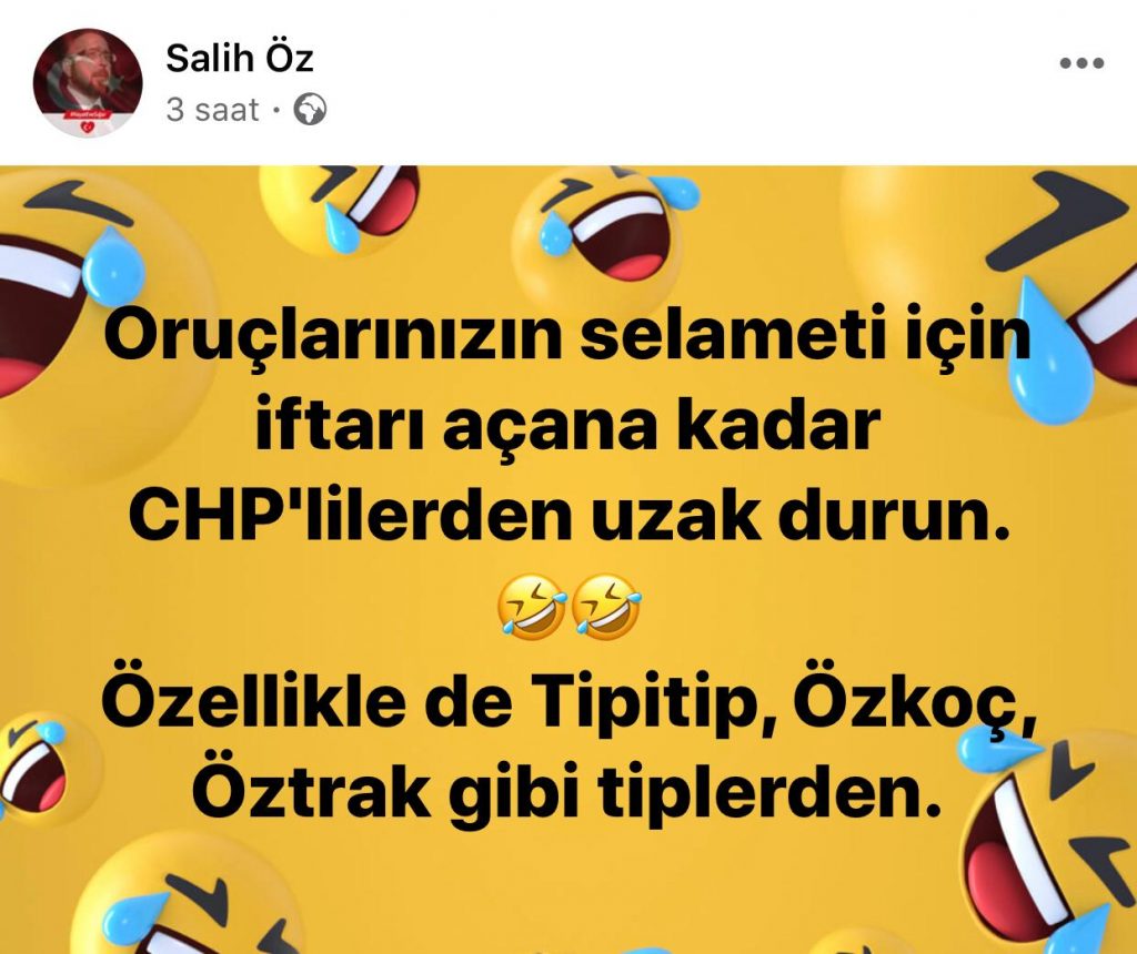 “Mersin’de görev yapan S.Ö. adlı bir öğretmen, sosyal medya hesabından “Şeytan Ramazan da bağlı olduğu için; Şeytanın yerine CHP’liler görevi üstlenmiş..” , “Bu sefer kimse elinde sadece bayrakla çıkmayacak bunu iyi bilin. Hodri meydan! Azdan az, çoktan çok gider!” gibi sözlerle halkı kin ve düşmanlığa sevk edici sözler ifade etmiştir. Açıkça yaptığı paylaşımlarla, Ana Muhalefet Partisi’ne ve diğer muhalif partilere karşı tehdit içeren mesajlar yayınlamıştır.